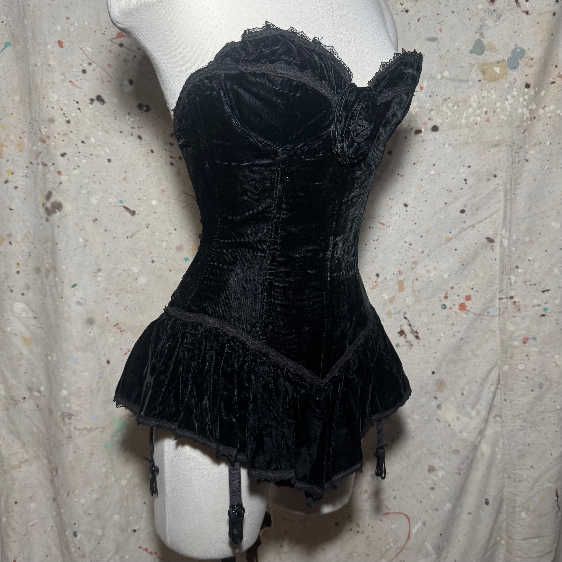 1990s TRASHY LINGERIE BLACK VELVET LACE FRILL FLOWER CORSET BUSTIER