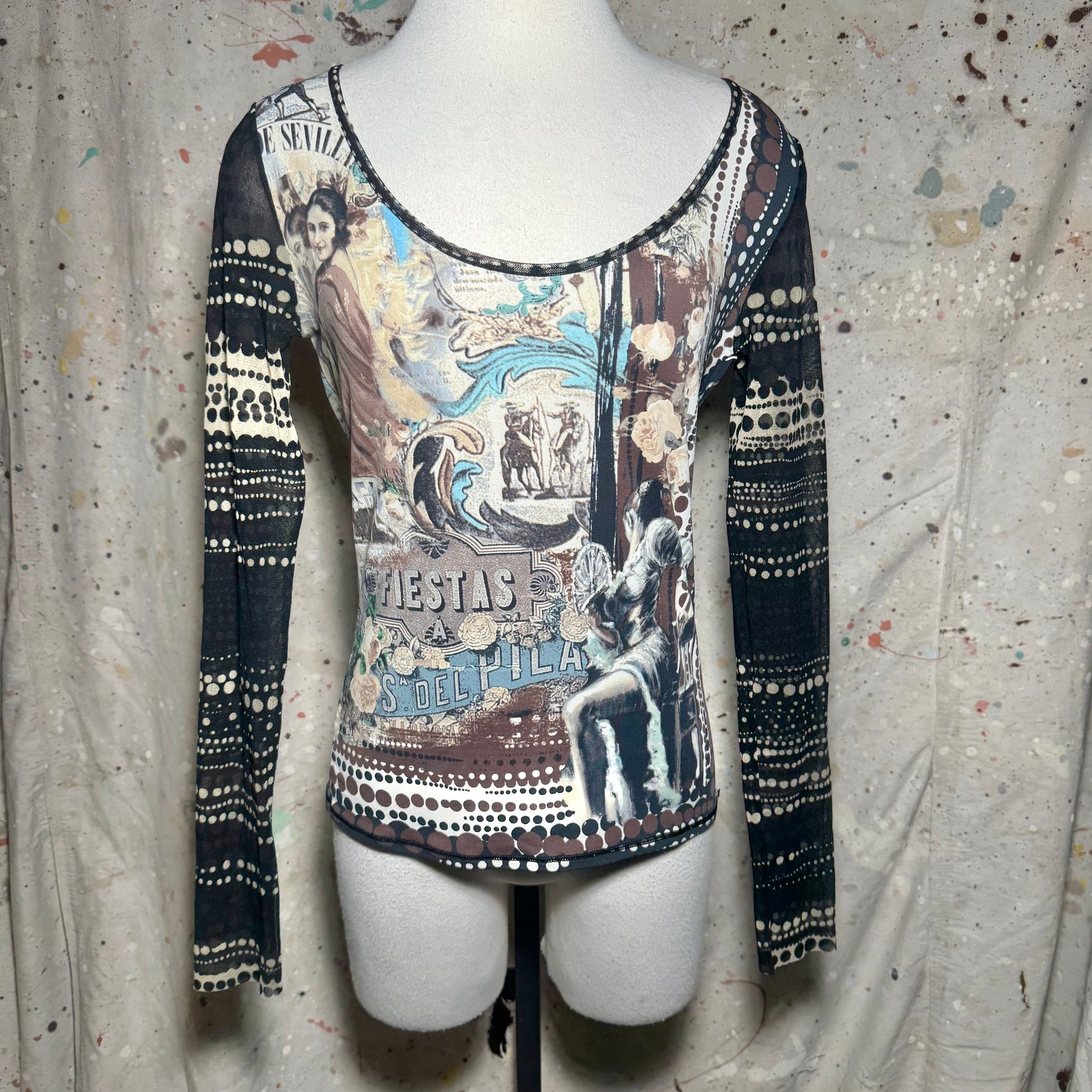 FUZZI ARTSY RENAISSANCE PRINTED MESH LONG SLEEVE TOP