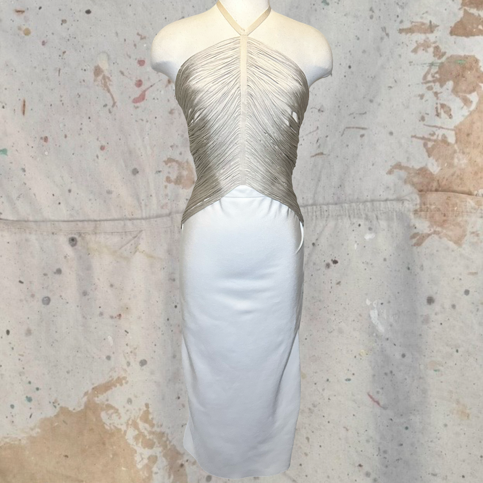 HERVE LEGER DRAPED HALTER FRINGE MIDI DRESS ADDISON
