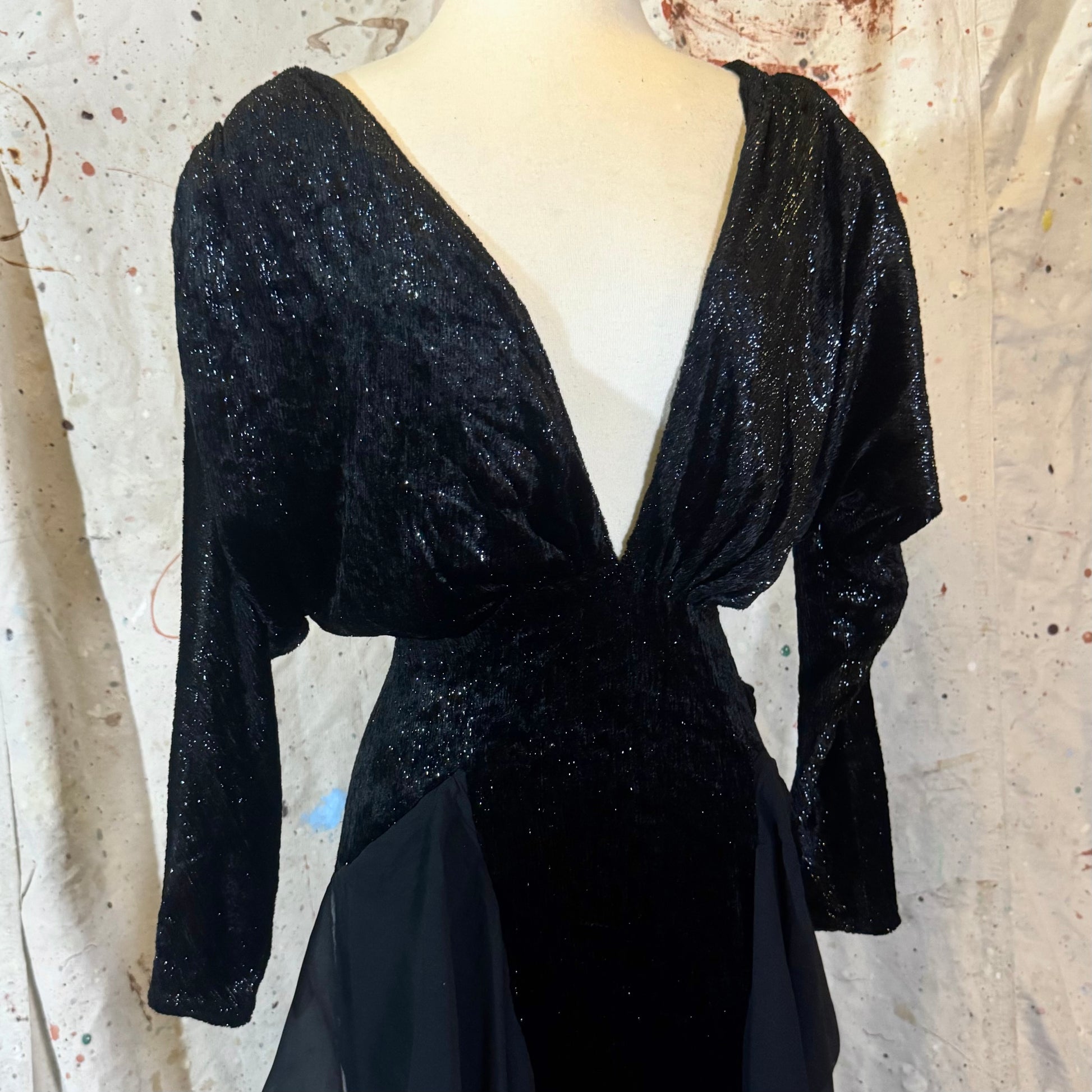70s / 80s ITALIAN SILK GLITTER LONG SLEEVE LOW PLUNGING FRONT BACK SILK TIERED DRESS